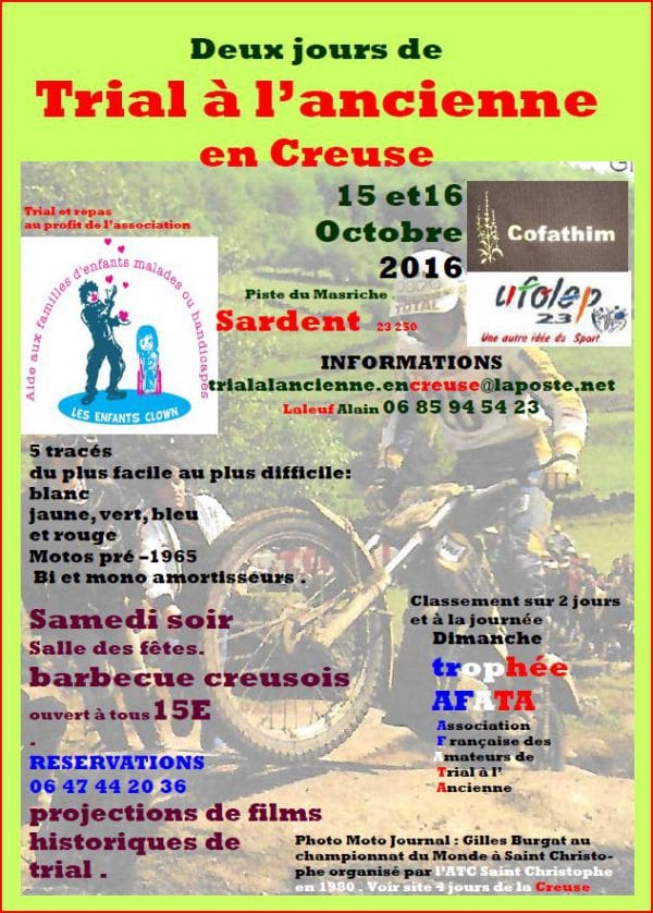 La seconde manche du Trophée AFATA 2016/17 aura lieu à Sardent (23) dans le cadre des 2 jours de Trial à l’Ancienne les 15 et 16 octobre 2016.