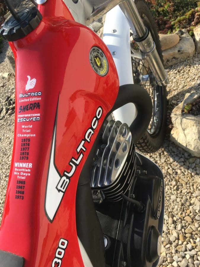 Ces connaisseurs ont raison, pourtant des passionnés de Bultaco ont développé un prototype de Sherpa, à motorisation Bultaco. Mais désirant présenter ce qu’aurait pu être une Bul moderne, ils l’ont équipé de composants actualisés concernant les freins, les suspensions, etc.