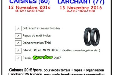 Trial Montreuil organise deux journées d’entraînement les 12 et 13 novembre prochain, à Caisnes (60) et Larchant (77). Différentes zones...