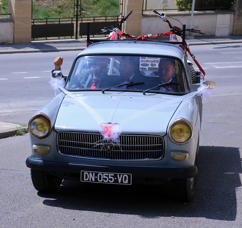… tandis qu’auparavant, Alex, Médéric Delannoy et Pierre-Vincent Meiffren, leurs deux témoins, déboulaient à bord  d’un 4 X 4 surpuissant au look – presque – typiquement US !