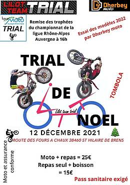 Leur trial de Noël vous attend sur leur terrain de Saint Hilaire de Brens (38). Et tout comme le repas proposé, le menu de la journée s’annonce copieux ! En effet, en plus du trial amical vous attendent une tombola, des essais des millésimes 2022 (merci à Dherbey Motos !) et le remise des prix de la ligue AuRA.