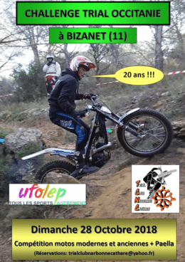 « Malgré les terribles inondations qui ont touchées durement notre département, le Trial Club Narbonne Cathare maintient l’organisation du Trial Ufolep de Bizanet (11) le 28 Octobre prochain.