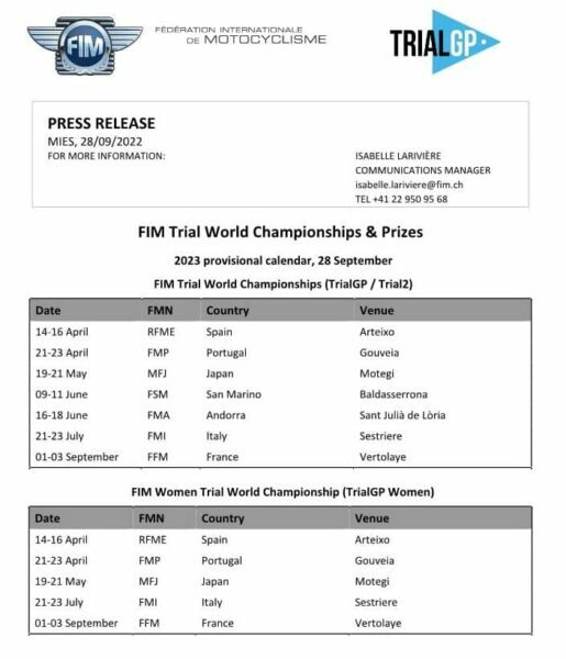 Voici le calendrier retenu : FIM-Trial-World-Championships-2023