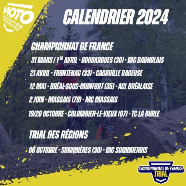 « La Fédération Française de Motocyclisme a le plaisir de lever le voile sur le calendrier 2024 du Championnat de France de Trial et du Championnat de France des Régions ! Les meilleurs pilotes de l’hexagone se retrouveront sur 5 dates en 2024 dont la première épreuve et la finale qui auront lieu sur deux jours !