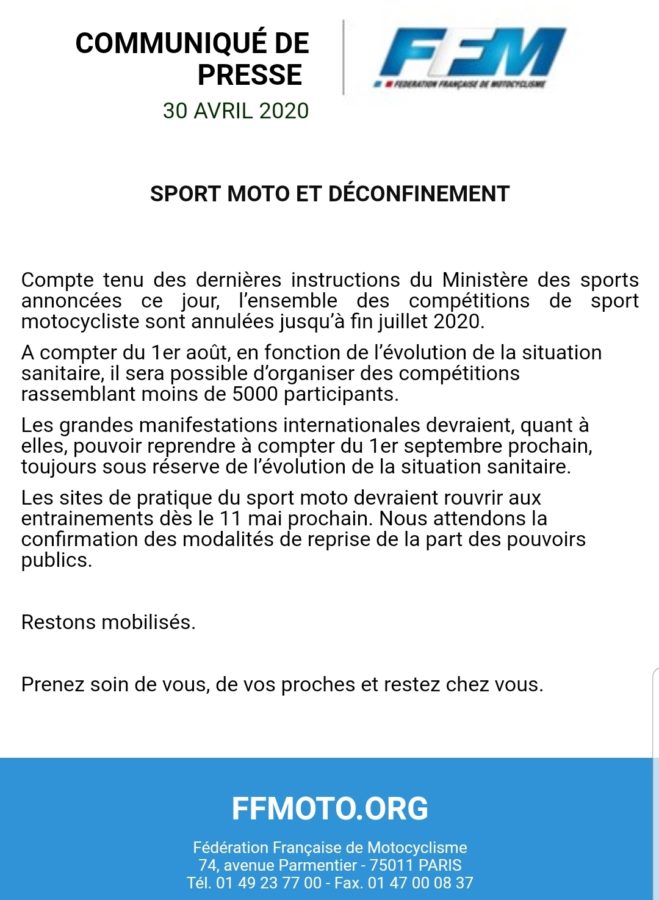… ne pourra reprendre qu’en septembre suite à la déclaration du premier ministre suivie de celle du Président de la Fédération et à l’annulation de l’épreuve de Lançon de Provence (13).