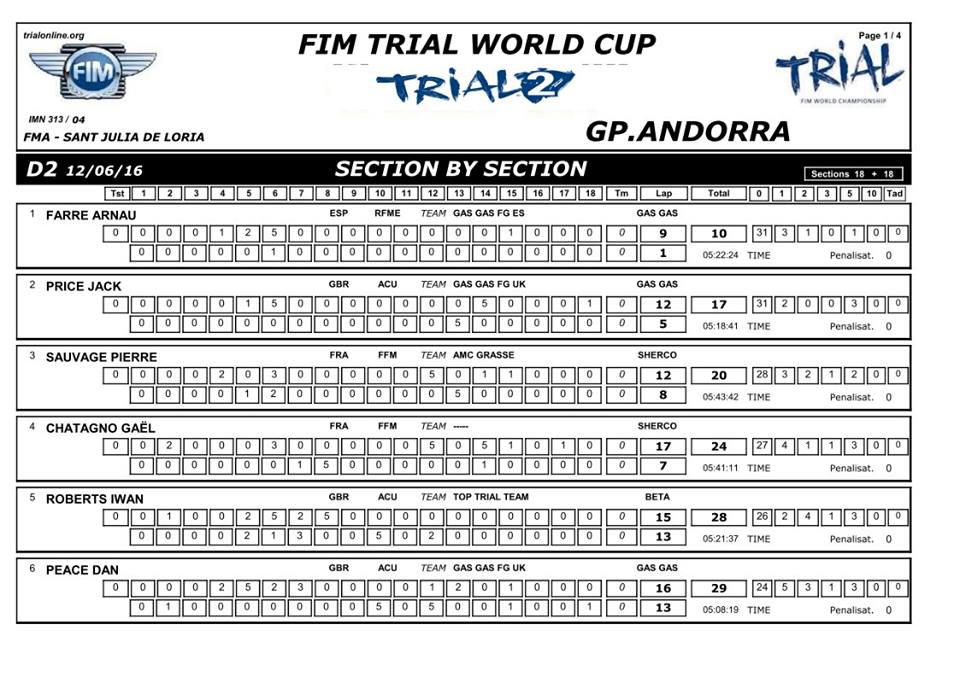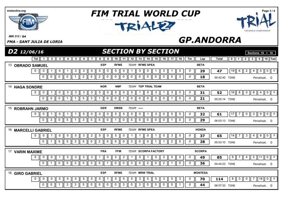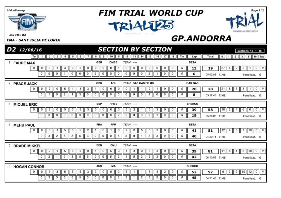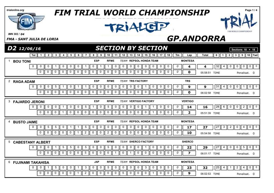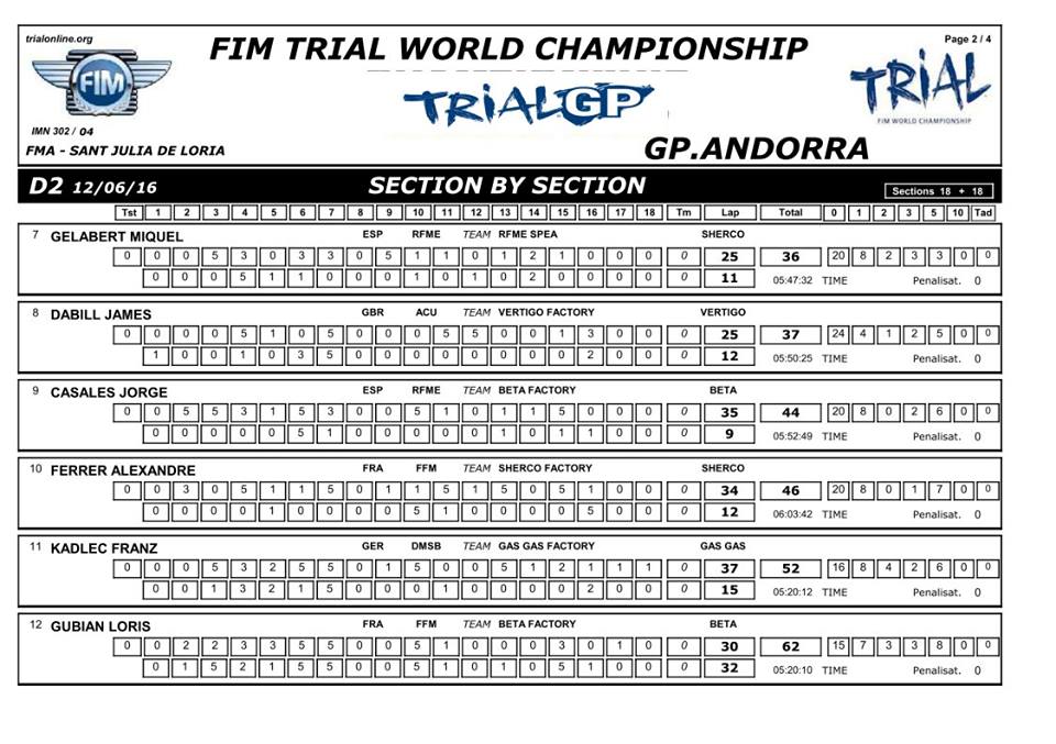 Lors de cette 2ème journée du championnat du Monde de Trial en Andorre, Toni Bou signe un doublé comme il l’avait déjà fait en Allemagne à Gefrees. Il devance Adam Raga de 5 points. Jeroni Fajardo monte sur son premier podium cette saison ! Jaime Busto termine encore au pied du podium et Takahisa Fujinami chute à la 6ème place après être monté sur le podium hier. Alexandre Ferrer se classe à nouveau à la 10ème place et Loris Gubian termine 12ème.
