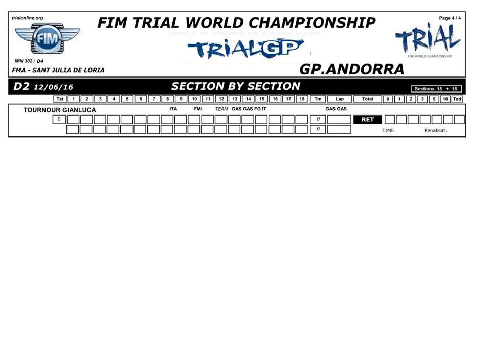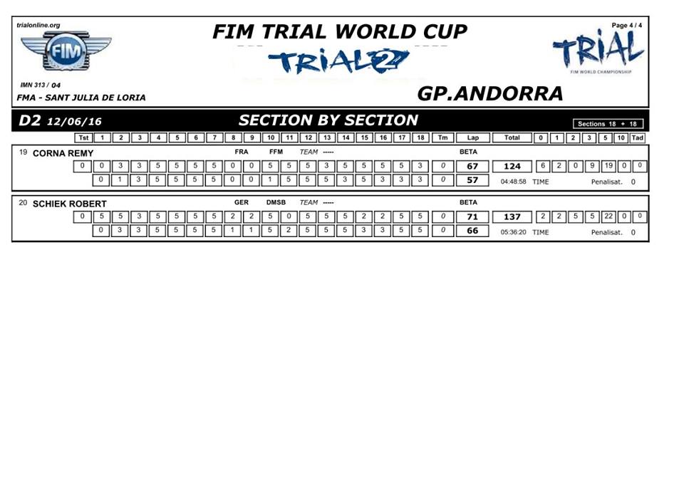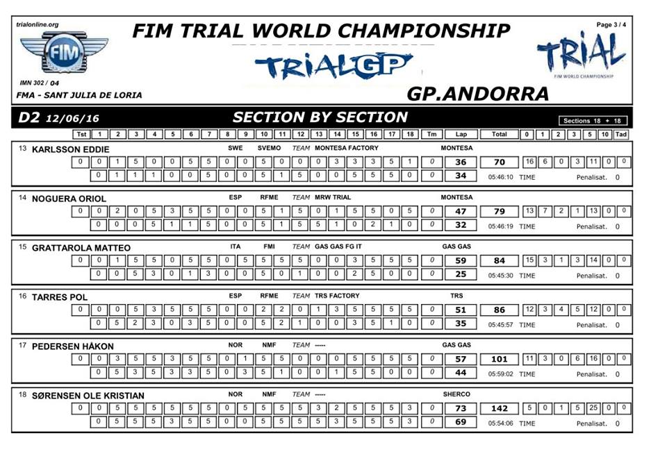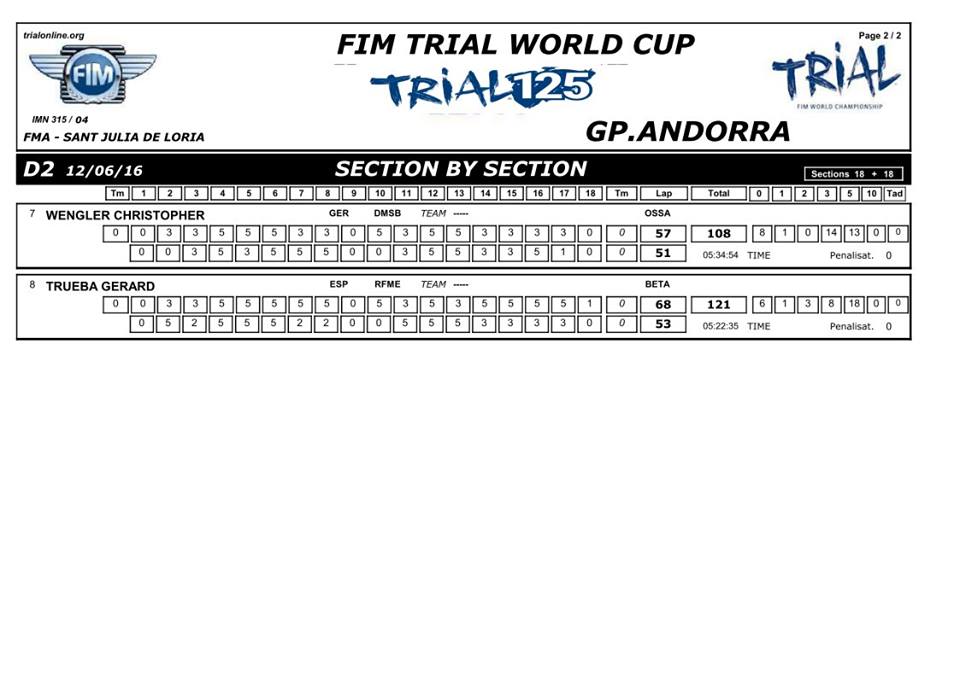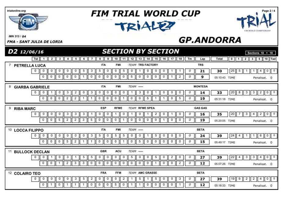 Lors de cette 2ème journée du championnat du Monde de Trial en Andorre, Toni Bou signe un doublé comme il l’avait déjà fait en Allemagne à Gefrees. Il devance Adam Raga de 5 points. Jeroni Fajardo monte sur son premier podium cette saison ! Jaime Busto termine encore au pied du podium et Takahisa Fujinami chute à la 6ème place après être monté sur le podium hier. Alexandre Ferrer se classe à nouveau à la 10ème place et Loris Gubian termine 12ème.