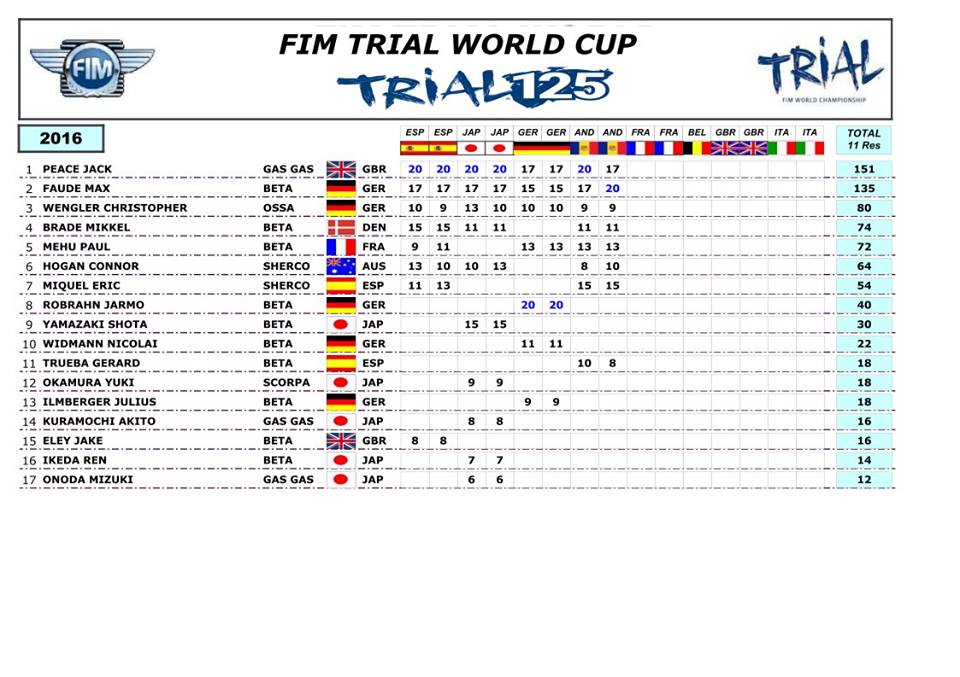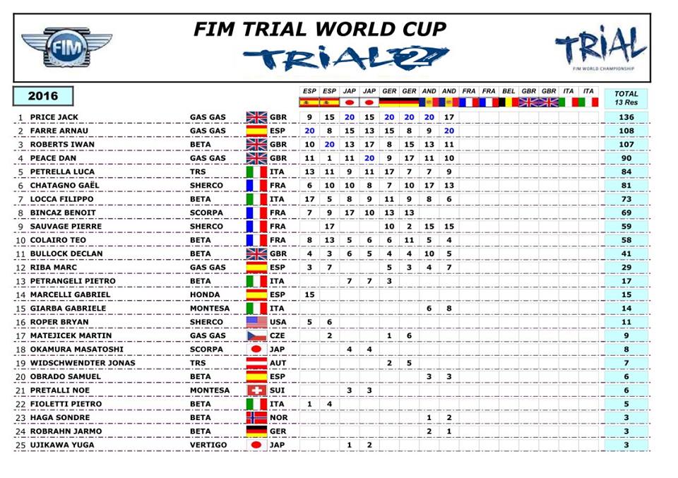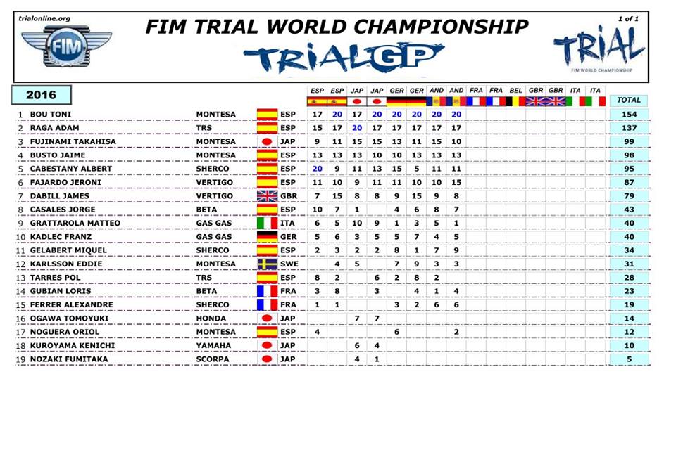 Au classement général après les deux manches en Andorre et avec deux victoires Toni Bou accentue encore son avance sur Adam Raga qui se retrouve désormais à 17 points. La 3ème place se joue dans un mouchoir de poche ; le podium de Fujinami lui permet de repasser devant Jaime Busto pour un petit point. Juste derrière Albert Cabestany n’est qu’à quatre points.