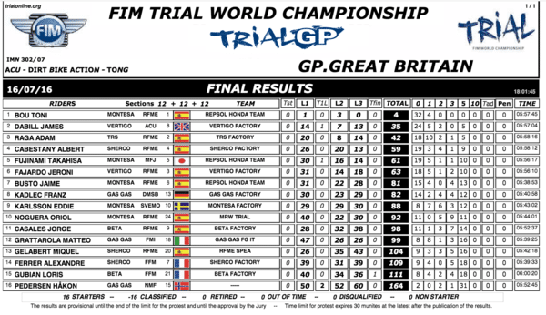Première journée du championnat du monde de trial en Grande-Bretagne à Tong et 9ème victoire de la saison pour Toni Bou qui a littéralement surclassé ses adversaires avec un score de 4 ! James Dabill signe son meilleur résultat de la saison à domicile avec la seconde place avec 31 points de plus que Toni Bou. Adam Raga doit se contenter de la 3ème place. Pour nos français ils sont 14ème (Alexandre Ferrer) et 15ème (Loris Gubian).