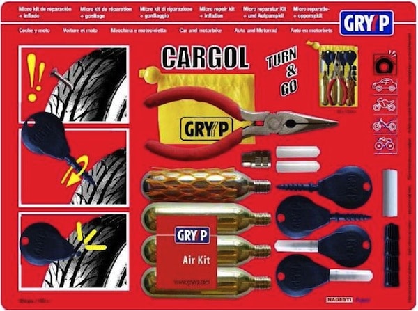 Il existe une multitude de kits réparation pneu, plus ou moins pratiques. Le plus connu est la bombe anti-crevaison, qui est pourtant la bête noire des concessionnaires car elle est difficile à nettoyer et broie littéralement le manomètre du garagiste qui fait la pression. Viennent ensuite les kits à mèche qui nécessitent de percer le pneu à l’endroit de la crevaison pour y insérer la mèche enduite de colle. Efficace bien qu’un peu salissant, mais ce n’est pas forcément le genre de matériel que l’on a toujours sur soi. C’est pourquoi la marque Gryyp a élaboré un kit de dépannage Cargol permettant de colmater une fuite très rapidement, pour un encombrement minimum.