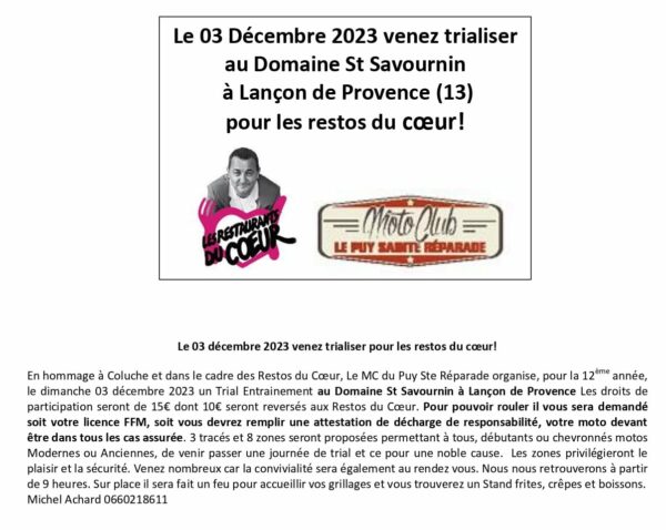Faire un bon coup de moto en plus d’une bonne action, sûr que ça l’auraIt branché, le gars Michel… Alors, le 1er dimanche de décembre, poussez donc une pointe jusqu’au domaine Saint Savournin pour aider les Restos du Coeur qui ont actuellement bien du mal à assurer pleinement leur mission…