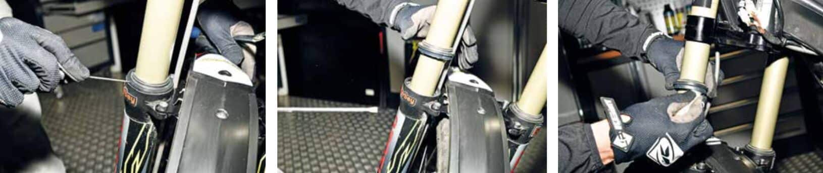 Les cache-poussière des tubes de fourche sont l’ultime protection de vos joints spi et des tubes. Il faut donc s’assurer de leur propreté au risque de voir le sable et la terre s’accumuler et attaquer le chromage des tubes, ce qui signifie d’incessantes fuites d’huile. Comment les nettoyer ? C’est simple, muni d’un petit tournevis plat et fin, vous déboîtez le cache de sa gorge puis le nettoyez à l’aide d’un chiffon et d’une pulvérisation de dégraissant. La pointe de votre tournevis peut aussi faire office de raclette. Ensuite, on lubrifie le tout avec un silicone pour caoutchouc, voire de l’huile, avant d’emboîter à la main le cache- poussière.