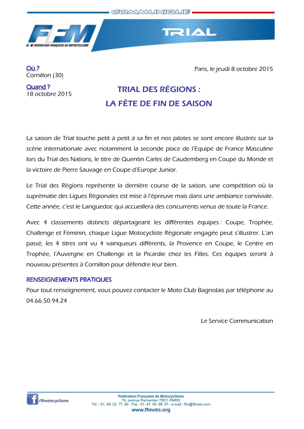 Communiqué FFM en vue du Trial des Régions à Cornillon le 18 octobre 2015.
