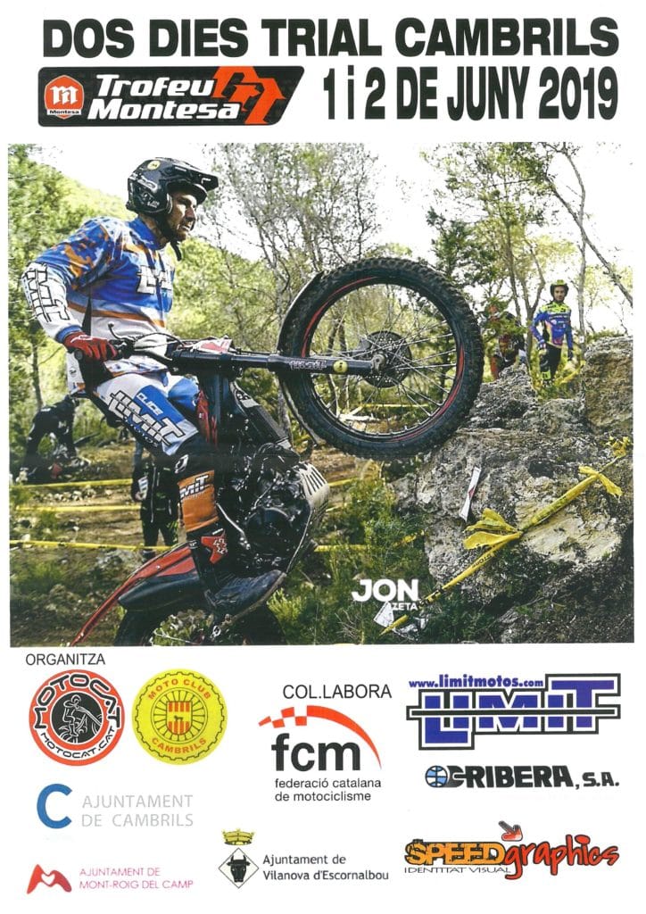 « Nous avons la joie de vous’annoncer que les 1er et 2 juin 2019 se courra en Catalogne un nouveau trial de deux jours destiné aux motos modernes. Cette rencontre résulte de la collaboration de Motocat avec le Moto Club de Cambrils. Elle bénéficie du soutien des villes de Cambrils et de Mont-Roig del Camp.