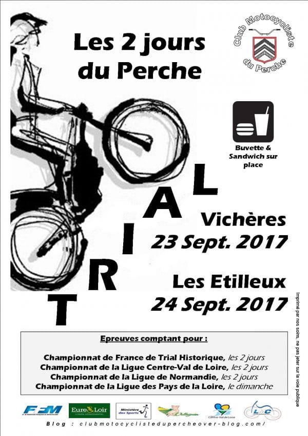 Le Club Motocycliste du Perche donne rendez-vous à tous les trialistes, les 23 et 24 septembre prochain, à Vichères (28) le samedi, et Les Etilleux (28) le dimanche, pour les Deux Jours du Perche. Cette épreuve comptera pour les championnats des Ligues du Centre-Val de Loire, de Normandie, des Pays de La Loire (seulement le dimanche), et pour le championnat de France de Trial Historique, pour la quatrième année consécutive. Chaque jour, un parcours spécifique pour les jeunes « mini-trial » sera mis en place.