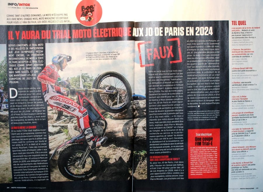 Ce sont nos confrères de Motomag qui dans leur N° 373 qui rétablissent la vérité. Et donc non, il n’y aura pas de trial électrique aux JO. Un dossier de candidature a bien été déposé auprès du Comité Internationale Olympique (CIO) par des représentants de la FFM et de la FIM.
