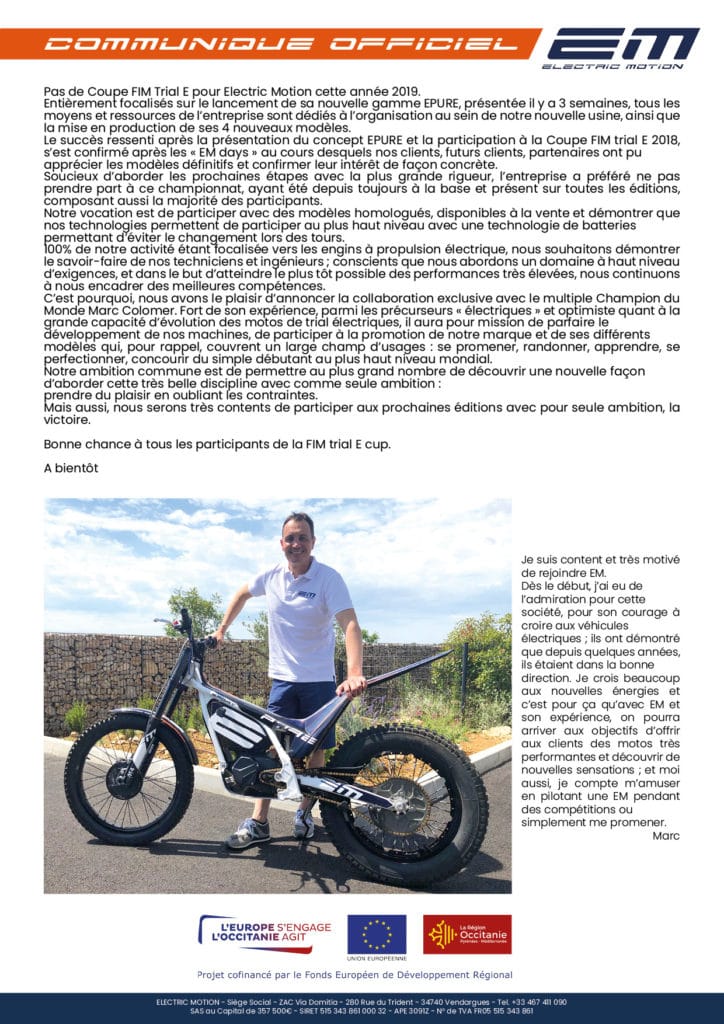 On avait pu s’étonner de l’absence d’EM de la catégorie TrialE au GP des Netherlands et de Belgique. La firme française en expose les raisons et confirme sa coopération avec Marc Colomer au travers de ce communiqué :