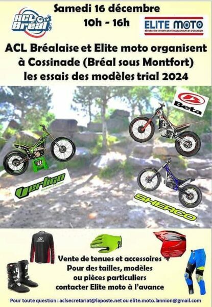 En association avec Elite Moto, l’ACL Bréalaise propose le samedi 16 / 12 des essais des millésimes 2024. Alors si vous avez envie de changer de modèle ou plus simplement de renouveler votre équipement, vous pourrez trouver votre bonheur sur place…