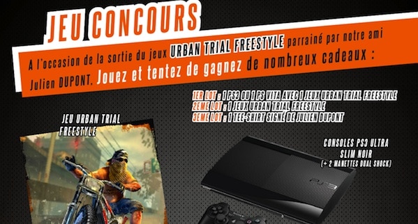 A l’occasion de la sortie du jeu URBAN TRIAL FREESTYLE parrainé par notre ami Julien DUPONT, jouez et tentez de gagner en répondant aux 3 questions suivantes :