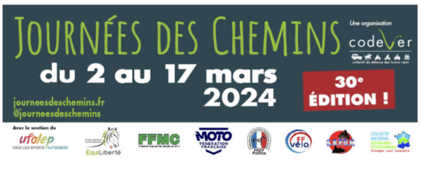 Les Journées des Chemins, événement annuel organisé par le Collectif des loisirs verts fêtera ses 30 ans cette année. Elles se dérouleront du samedi 2 mars au dimanche 17 mars 2024, avec de nombreux événements à la clé.