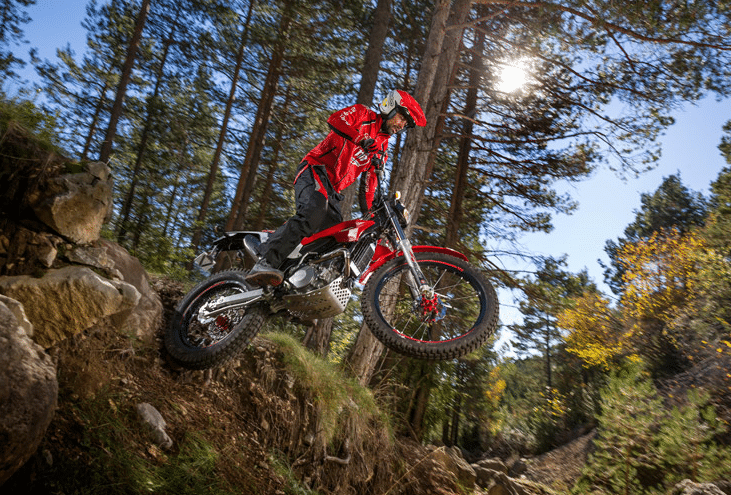 Mécaniquement, la principale modification concerne l’étagement de la boite de vitesse avec les 4 premiers rapports plus espacés que sur la moto de trial, le dernier étant quant à lui identique, tout comme la démultiplication finale (10/41). Les maps d’injection diffèrent également et un soin tout particulier a été apporté à la discrétion de l’échappement. Nous reviendrons plus en détail sur les différents autres évolutions techniques dans TM N°77, mais sachez déjà qu’avec tous les éléments indispensables à l’homologation, la belle catalane affiche 81 kgs à sec, que la production en série démarrera en février, que la période de garantie devrait être de deux ans et que le tarif proche de 8 100 €.