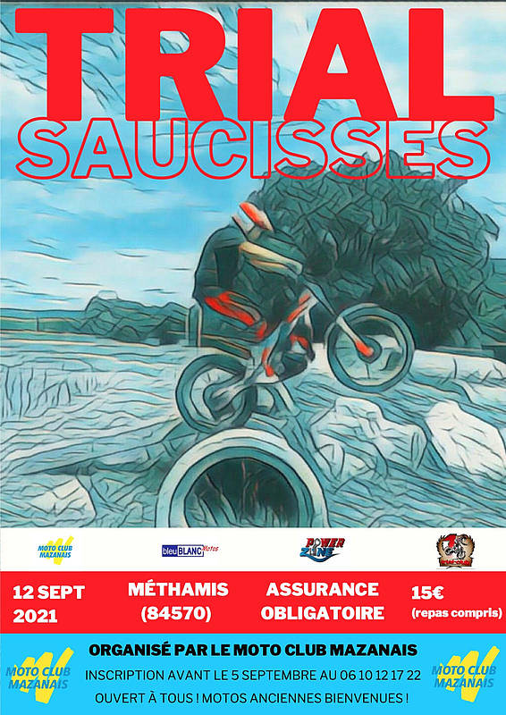 ‘Voici  l’affiche du Trial Saucisses qui se déroulera le 12 septembre 2021 sur le terrain Blanc Motos à Méthamis (84).