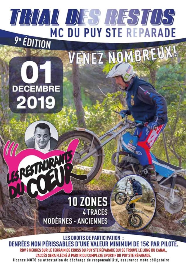 « En hommage à Coluche et dans le cadre des Restos du Cœur, Le MC du Puy Sainte Réparade (13) organise pour la 9ème année le dimanche 01 décembre 2019 un trial entraînement.