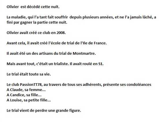 Trial Magazine tient sincèrement à s’associer à la douleur de sa famille et de tous ses proches et amis. Les obsèques ne réuniront que la proche famille, mais on sera nombreux à accompagner par la pensée Olivier pour ce dernier bout de chemin.