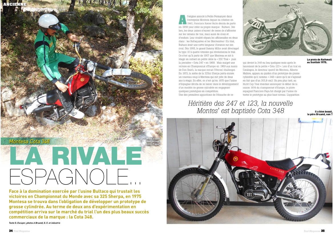 Face à la domination exercée par l’usine Bultaco qui trustait les victoires en Championnat du Monde avec sa 325 Sherpa, en 1975 Montesa se trouva dans l’obligation de développer un prototype de grosse cylindrée. Au terme de deux ans d’expérimentation en compétition arriva sur le marché du trial l’un des plus beaux succès commerciaux de la marque : la Cota 348.