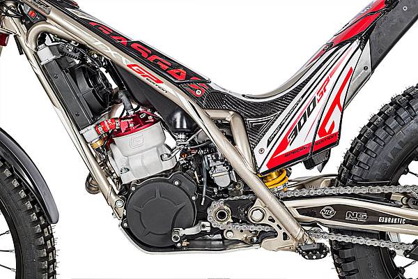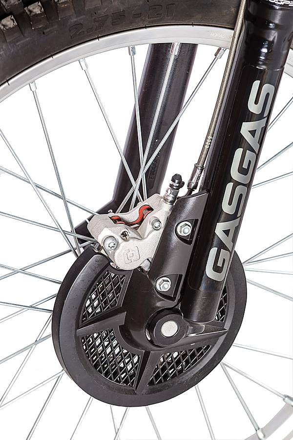 En effet, suspensions Olle, freins (tous deux au guidon !), pneus Mitas sont évidemment moins hauts de gamme que ceux de la monture qui a permis à Loris Gubian de remporter le Championnat du Monde !