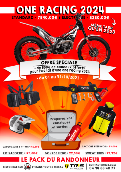 Plus de 500 € d’équipements offerts à l’achat d’une TRRS One Racing 2024, ça cause, non ? Voici l’offre dont vous pouvez bénéficier :