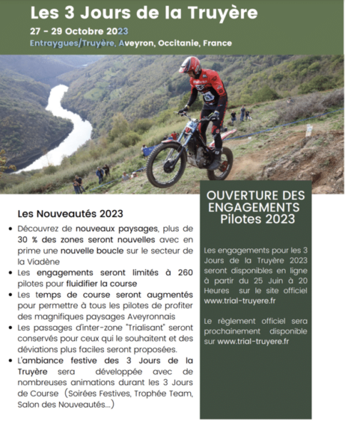 Le Trial Club Saint Mamet qui organise Les 3 Jours du Cantal organisera les 27, 28 et 29 Octobre prochains, la 8ème Edition des 3 Jours de la Truyère, aussi appelée L’Hivernale des Trialistes. Cette compétition internationale de moto trial se déroulera à Entraygues sur Truyère dans le Nord-Aveyron.