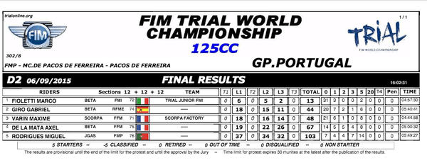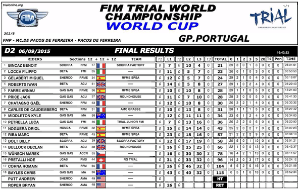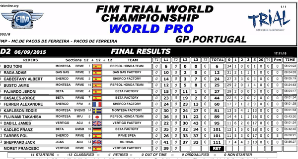 Toni Bou réitère avec une victoire le dimanche au Portugal. Il s’empare donc pour une neuvième fois du titre mondial alors qu’il reste encore deux manches à disputer en Espagne la semaine prochaine (« Plus qu’heureux de remporter neuf titres de suite !« ). Adam Raga finit deuxième de la course et valide donc sa place de vice-champion du monde. Albert Cabestany prend la 3ème place devant Jaime Busto (« Deux quatrièmes positions, très près du podium .Incroyable Toni Bou qui gagne un autre titre !!!! ») pour seulement 1 petit point. Alexandre Ferrer prend encore la 7ème place et il est encore une fois le premier non espagnol. J2Portugal