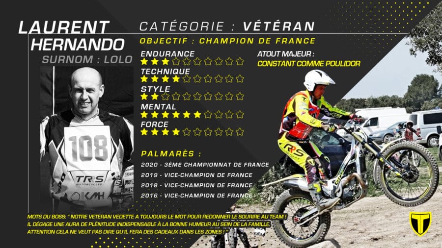 « Joyeux luron, notre patriarche du Team Laurent Hernando est un pilier dans la structure TRRS France. De nature tenace, Laurent se donne à fond !