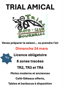 Le 16/06, Le MC Bourbriac (22) organisera un trial pris en compte pour le Championnat de ligue de Bretagne. Et jamais avare d’efforts et histoire de réveiller les physiques & réflexes encore possiblement somnolents, le club vous propose le 24 mars un petit roulage amical : sympa, n’est-ce pas ?!