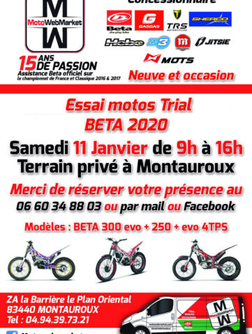 Le concessionnaire trial du 83, MotoWebMarket, organise des essais des Beta trial 2020 le samedi 11 janvier 2020 de 9h00...