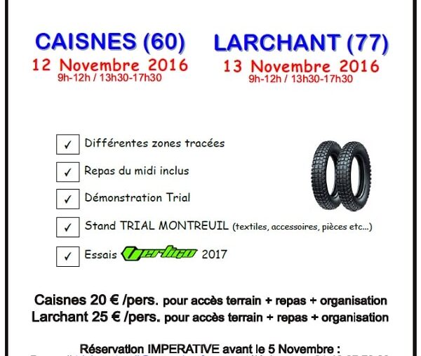 Trial Montreuil organise deux journées d’entraînement les 12 et 13 novembre prochain, à Caisnes (60) et Larchant (77). Différentes zones...