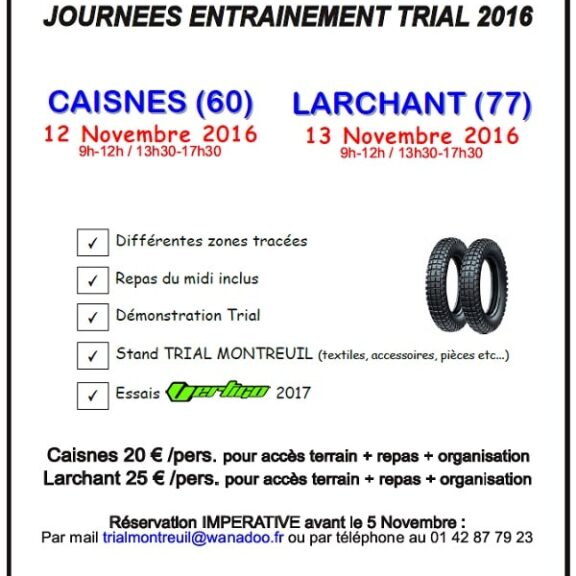Trial Montreuil organise deux journées d’entraînement les 12 et 13 novembre prochain, à Caisnes (60) et Larchant (77). Différentes zones...
