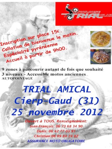 Le Trial amical de Cierp-Gaud (3) se tiendra le 25 novembre 2012. Inscription sur place 15€. Collation de bienvenue le...