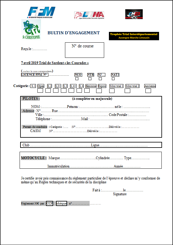 c’est avec plaisir que l’ATC St Christophe (23) vous convie à son trial du 7 Avril à Sardent (23) comptant pour le Trophée AuRA zone ouest, le Trophée Trial Auvergne Marche Limousin 2019 et le championnat de la ligue LMNA.