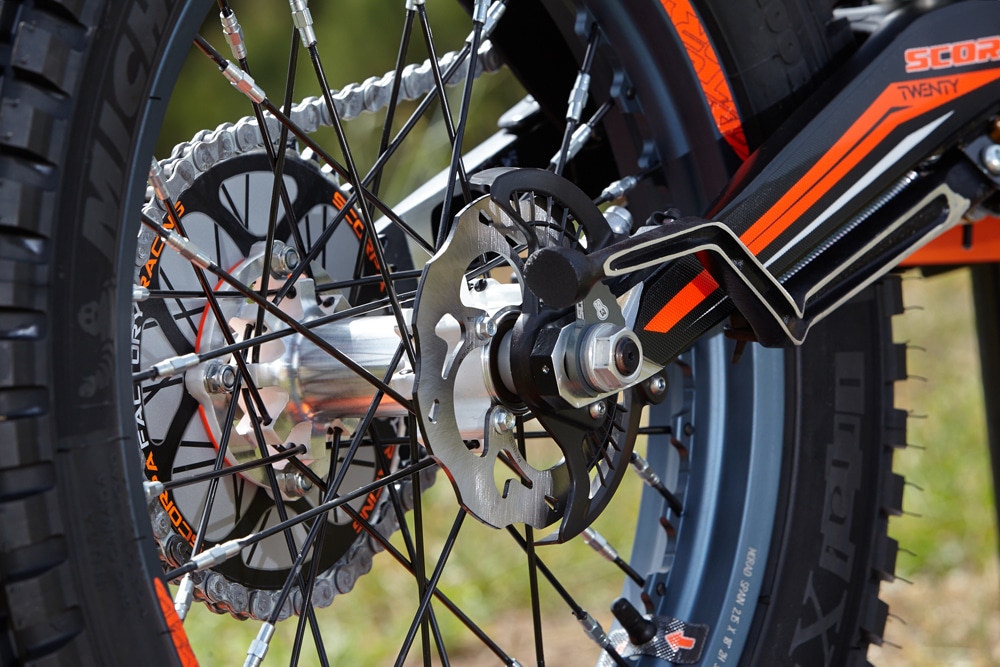 Jante arrière: Fabriquée par MORAD, anodisée graphite, son usinage permet d’alléger l’ensemble.