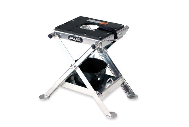 Le lève moto X-Stand en alu pliable dispose d’un revêtement caoutchouc sur le plateau pour une adhérence optimale de votre machine. Pliable, il est peu encombrant dans le fourgon et est même fourni avec un bac récupérateur pour l’huile de votre monture. Qui plus est, il est tellement stylé que vous pouvez le faire passer pour une oeuvre d’art contemporaine dérobée dans quelque musée mal gardé. Une aubaine !