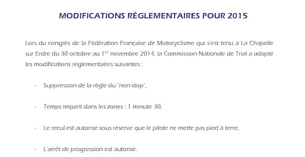 Lors du congrès de la Fédération Française de Motocyclisme qui s’est tenu à La Chapelle sur Erdre du 30 octobre au 1er novembre 2014, la Commission Nationale de Trial a adopté les modifications réglementaires suivantes :