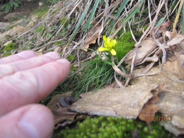 Rappel des faits par Bernard Bramonte du TCS : « Pour ceux qui l’ignoreraient encore , le terrain est menacé d’un Arrété Préfectoral de Protection de Biotope ( APPB ) pour protéger une fleur rare la « Gagée des Rochers ». Cette fleur est protégée par nos soins depuis 1995, et 3 parcelles nouvelles sont apparues en 2011, que nous avons également protégées. Alors pourquoi un tel Projet d’APPB ? Il faut peut être chercher des explications auprès de certaines associations en se posant la question de leurs objectifs réels ( subventions … ) et/ou auprès des services de l’Etat en charge de l’instruction de ce dossier dont on peut s’interroger sur l’impartialité. Par exemple rien de ce qui concerne l’apparition de cette espèce sur notre terrain n’est mentionné dans l’étude produite non plus que le fait qu’elle continue de se développer grâce à nos actions ce qui montre que le trial et la protection de la fleur sont en parfaite symbiose ! Quoiqu’il en soit, voir ce reportage photo qui montre la fleur à son début d’éclosion à partir d’hier le 30 Janvier 2013 lors de notre entrainement du mercredi. Faut dire que depuis 2005, je suis sur le terrain en moyenne 2 fois par semaine ce qui permet une couverture et une connaissance des lieus bien plus importante que n’importe quel piéton qui viendrait s’y balader 2 ou 3 fois par an ! »