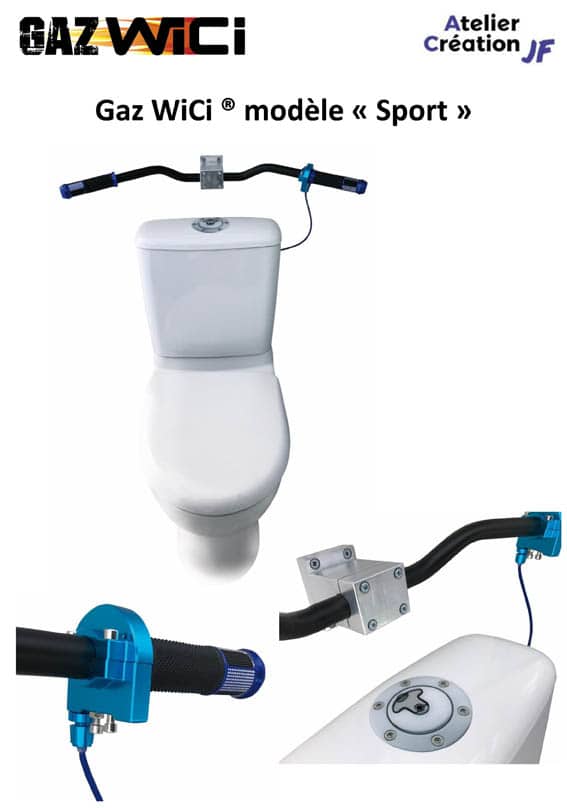 Gaz WiCi ® est un kit de transformation pour WC, qui permet de tirer la chasse d’eau des toilettes à l’aide d’une poignée de gaz de moto !