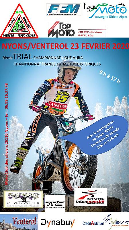 « Neuvième trial des oliviers de Nyons (26) , à ce jour plus de 100 inscrits ! Parmi les pilotes attendus en Elite : Alex Ferrer, Hugo Dufrese, Arthur et Rémi Rovery,Jérôme Béthune, Kenny Thomas, et 1 ou 2 autres en attente.