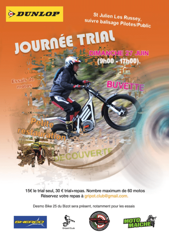 Le Gripot Club propose un trial découverte à Saint Julien les Russey (25) le 27 juin. Une journée à la cool, pour permettre même aux débutants et pratiquants occasionnels de s’amuser sans risque. Possibilité de restauration (voir règlement ci-dessous), mais nombre de places limitées, alors inscrivez-vous très vite Inscription_Trial_Famille