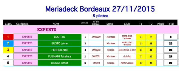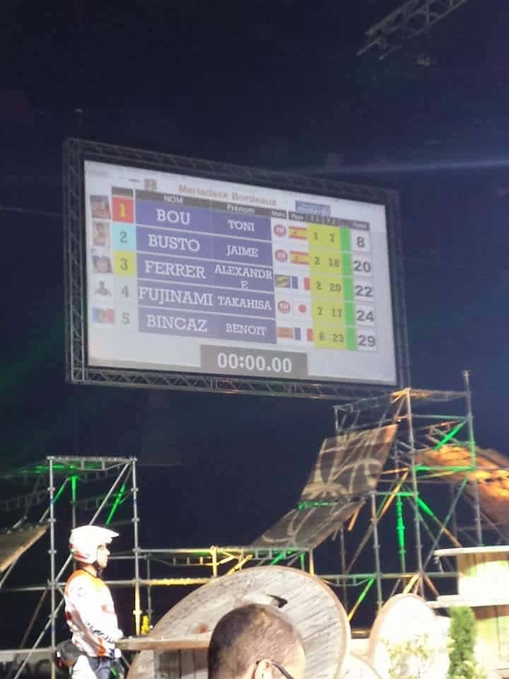 Au terme du trial indoor de Bordeaux, Toni Bou rafle une nouvelle fois la première place avec 8 points. Toujours aussi impérial, il s’impose avec 12 points d’avance sur son compatriote Jaime Busto 20 points. Alexandre Ferrer complète ce podium avec un total de 22 points. Takahisa Fujinami prend la 4ème place devant Benoît Bincaz.