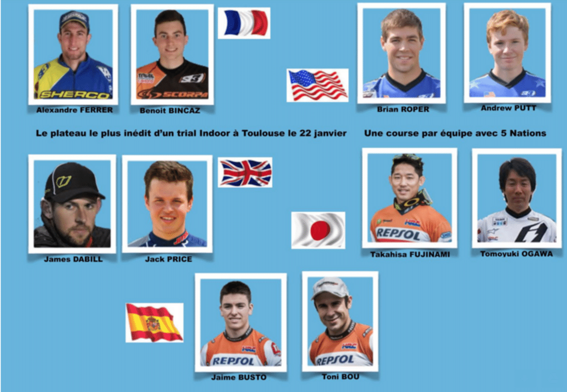 Infos sur le trial indoor de Toulouse du 22 janvier prochain : 10 pilotes 5 nationalités et 5 zones. Les pilotes vont rouler en équipe et le classement sera établi par équipes, avec vraiment des chances pour toutes les équipes de remporter cette 29éme édition.