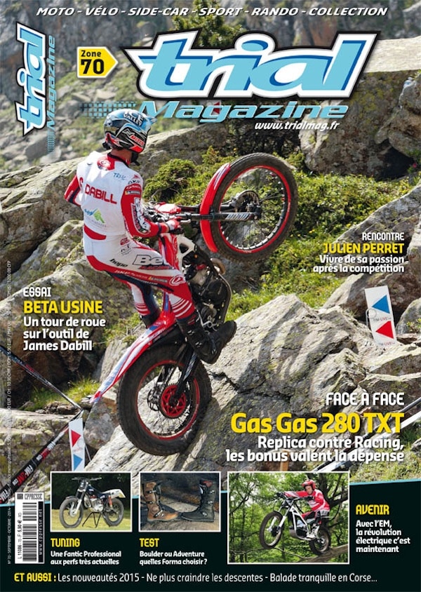 On y découvrira les gammes 2015 Jotagas et Scorpa. Notre essayeur vous dit également tout le bien qu’il pense de l’Electric Motion 5.7, qui est désormais disponible en version homologuée. La question n’est pas de savoir «si» le trial électrique va se développer mais «quand». La face à face de ce numéro oppose deux sœurs, les Gas Gas 280 TXT «Racing» et «Replica Factory». Dans la série des motos d’exception, Trial Mag a pu essayer la Beta de James Dabill ! Exceptionnelle est aussi la virée en Corse que la rédaction a eu l’occasion de faire.